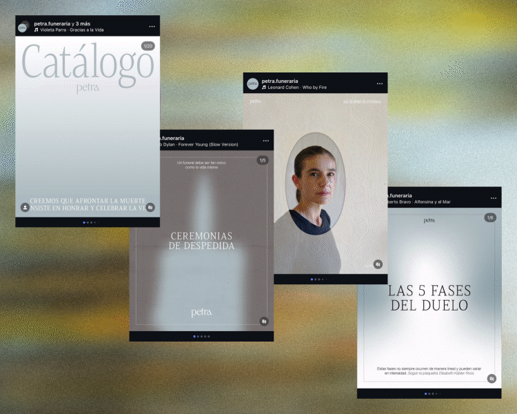 Branding — Diseño de identidad y relato visual para el proyecto funerario Petra . Créditos: Ritmo Estudio.